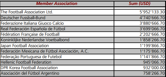 Los gastos incluyen tanto los premios como los pagos a los clubes por la cesión de jugadores, así como unas cantidades a las federaciones para ayudarlas en su labor. Así, por ejemplo, el FC Barcelona fue el club que más dinero recibió por sus jugadores: 866.267 dólares; mientras que la Federación que más ingresó fue la Federación inglesa, la FA, con 5,95 millones de dólares.